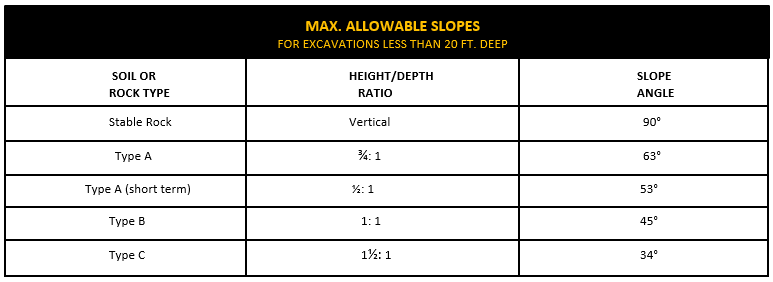Type A soil cannot be: fissured; subjected to vibration from heavy traffic; pile driving or similar effects; Previously disturbed part of a sloped, layered system where the lavers dis into the excavation on a slope of 4 horizontal to 1 vertical (4H:1V) or greater, material subjected to other factors that would require it to be classified as a less stable material.